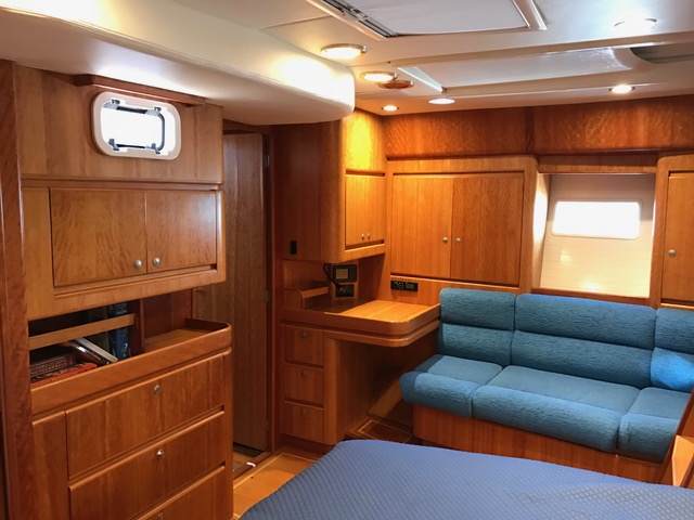 Amidships is the lower salon, where there is plush sofa seating for reading, conversation or watching films on the widescreen TV. Stairs connect up to the main deck salon, where there is a C-shaped sofa around a small table on ...