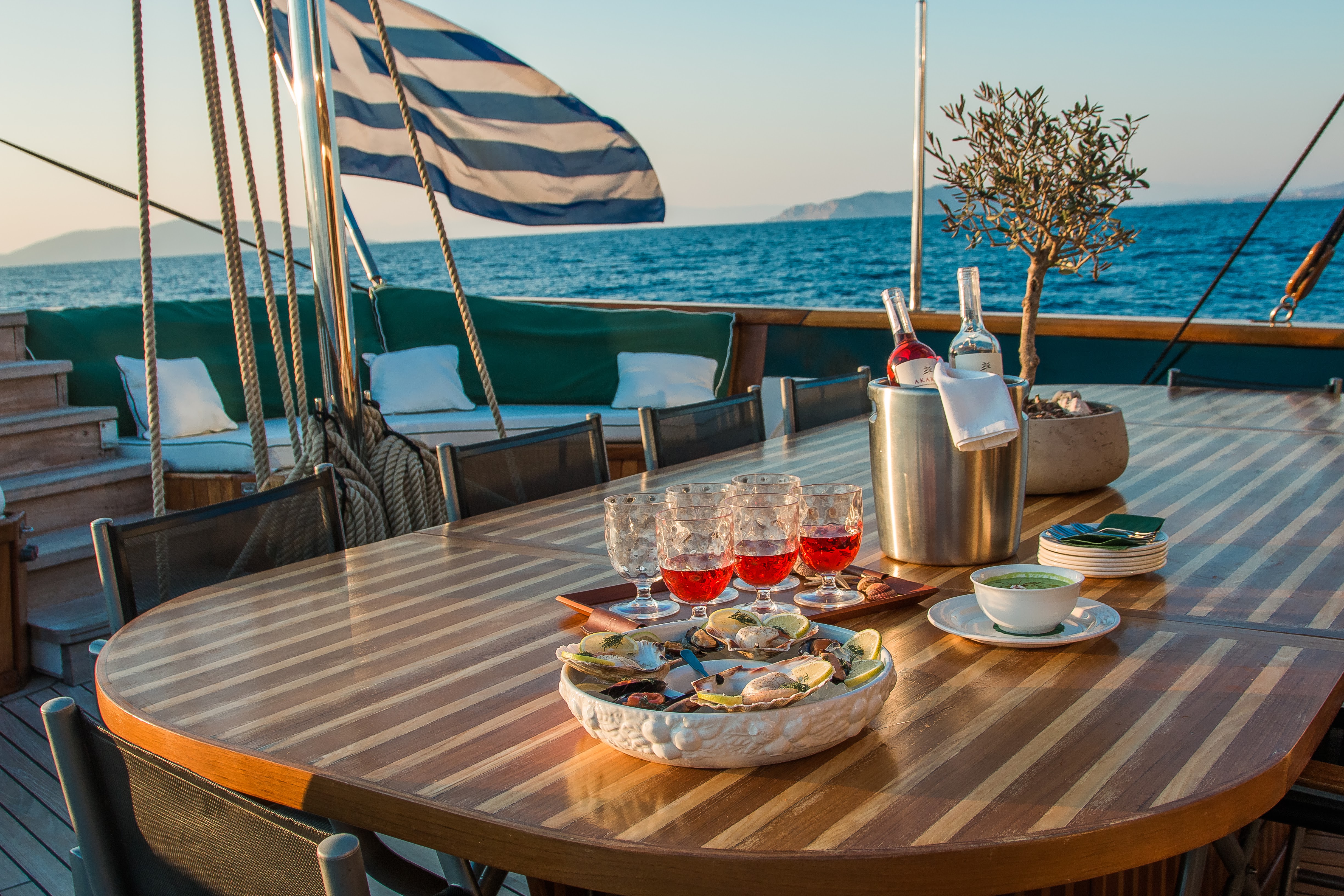 There’s an outdoor table and chairs for al fresco dining as well as a beautifully furnished stateroom, just right for indoor cuisine.