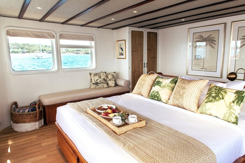 Her 5 spacious air-conditioned cabins are all uniquely situated above deck, promising large windows that draw in the spectacular ocean views. Each one features high ceilings and an en-suite bathroom.