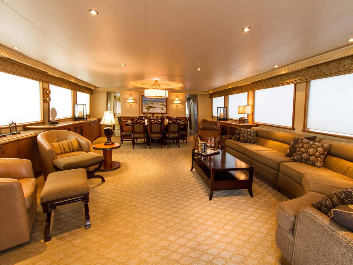 An open plan salon and dining offers a contemporary layout. The generous lounge with sumptuous soft furnishings is aft and the formal dining area is forward. On the starboard side a foyer leads to the day head, followed by a fully equipped country style galley, with casual eating area.