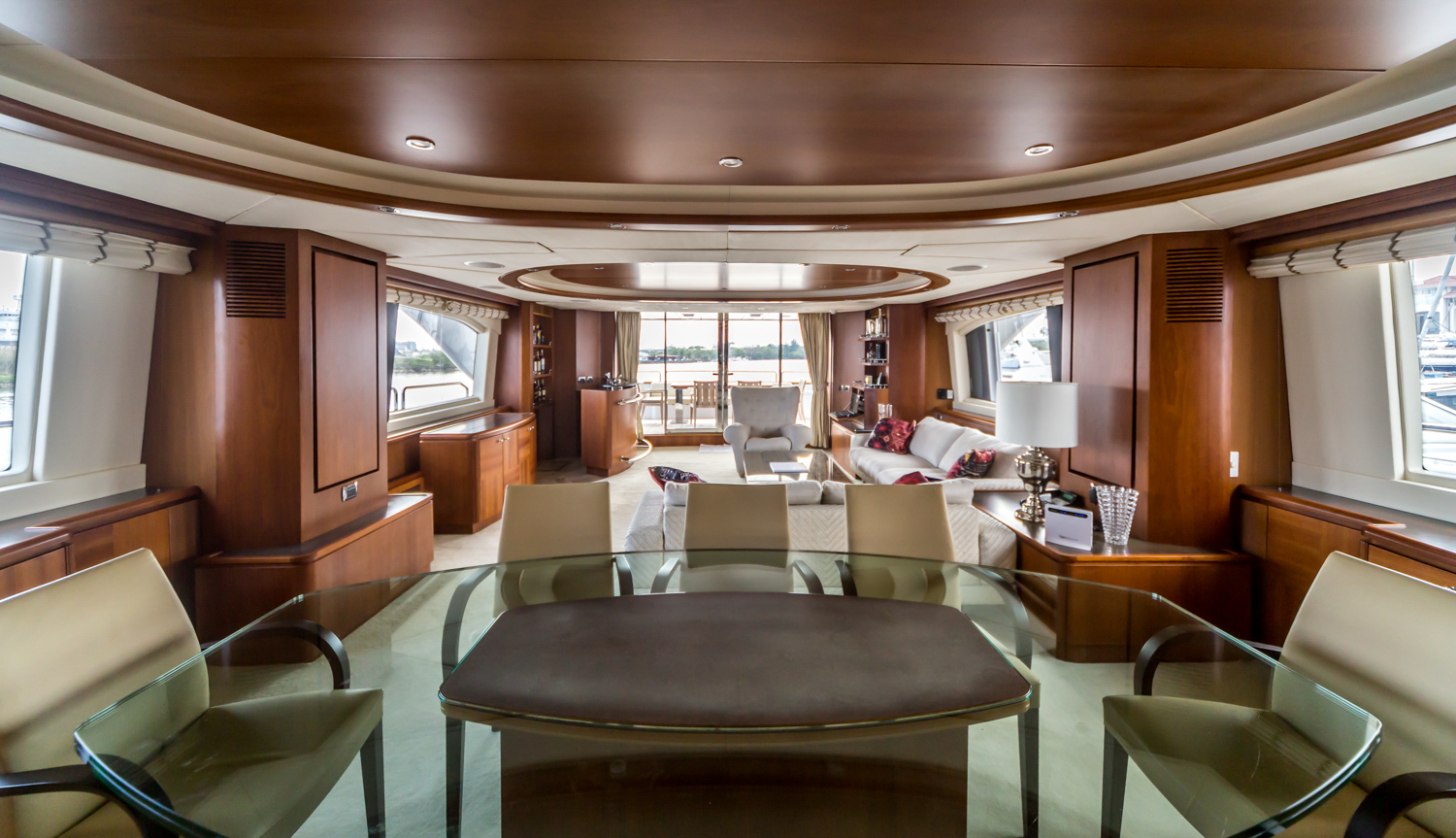 The yacht features a contemporary open plan salon and dining, with a spacious lounge aft and formal dining forward. The decor is neutral with light toned soft furnishings and warm woods. Below decks are 4 cabins, each offering private en-suite facilities.