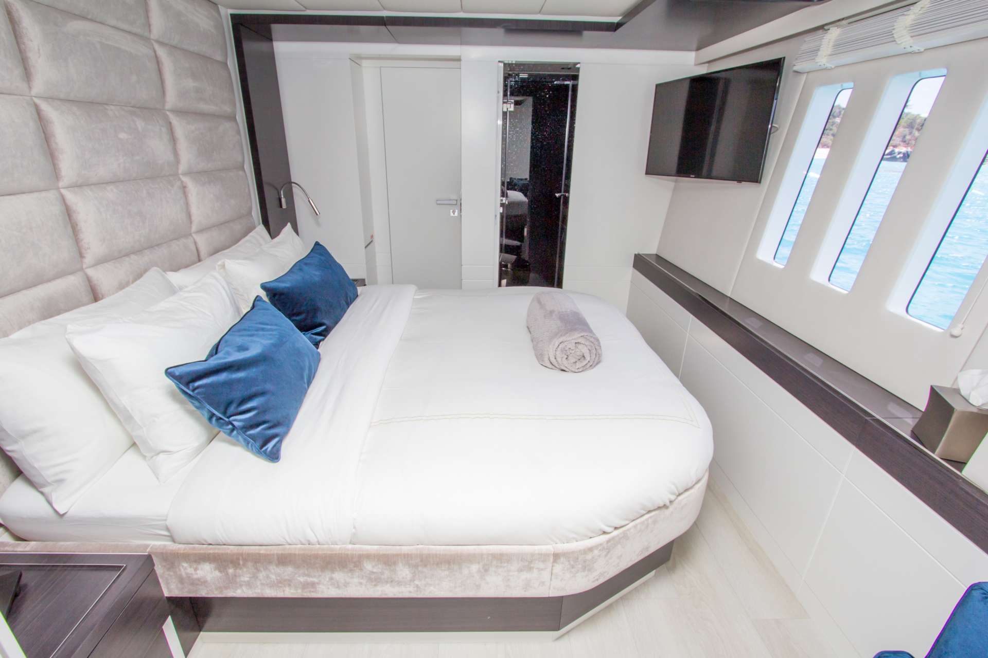 The accommodation sleeps up to eight guests over four spacious en-suite cabins, plus a single foredeck cabin suitable for a child, and a crew of four to keep everything running smoothly throughout the cruise.