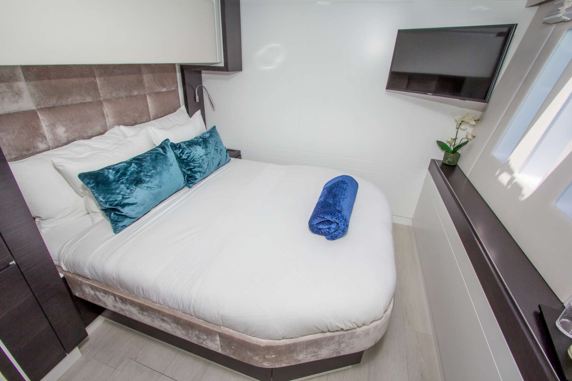 The accommodation sleeps up to eight guests over four spacious en-suite cabins, plus a single foredeck cabin suitable for a child, and a crew of four to keep everything running smoothly throughout the cruise.