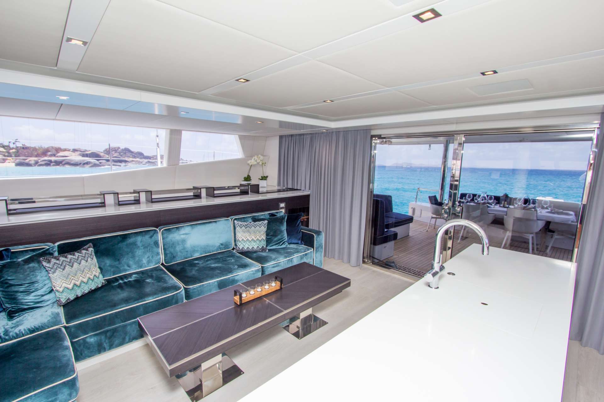 Beneath the hardtop, there is a C-shaped sofa around an alfresco dining table, with sunpads to starboard and a Jacuzzi along the stern.
