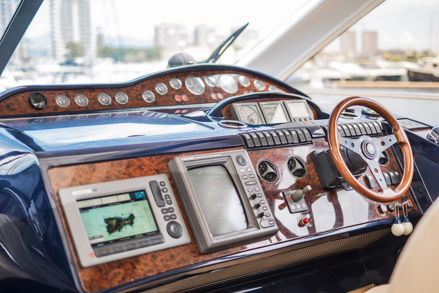 Behind the helm controls is a well laid out living and dining area, with a dining table with couch seating on the starboard side. To port is another matching couch, creating plenty of space to socialize with friends and enjoy al fresco meals and refreshments.