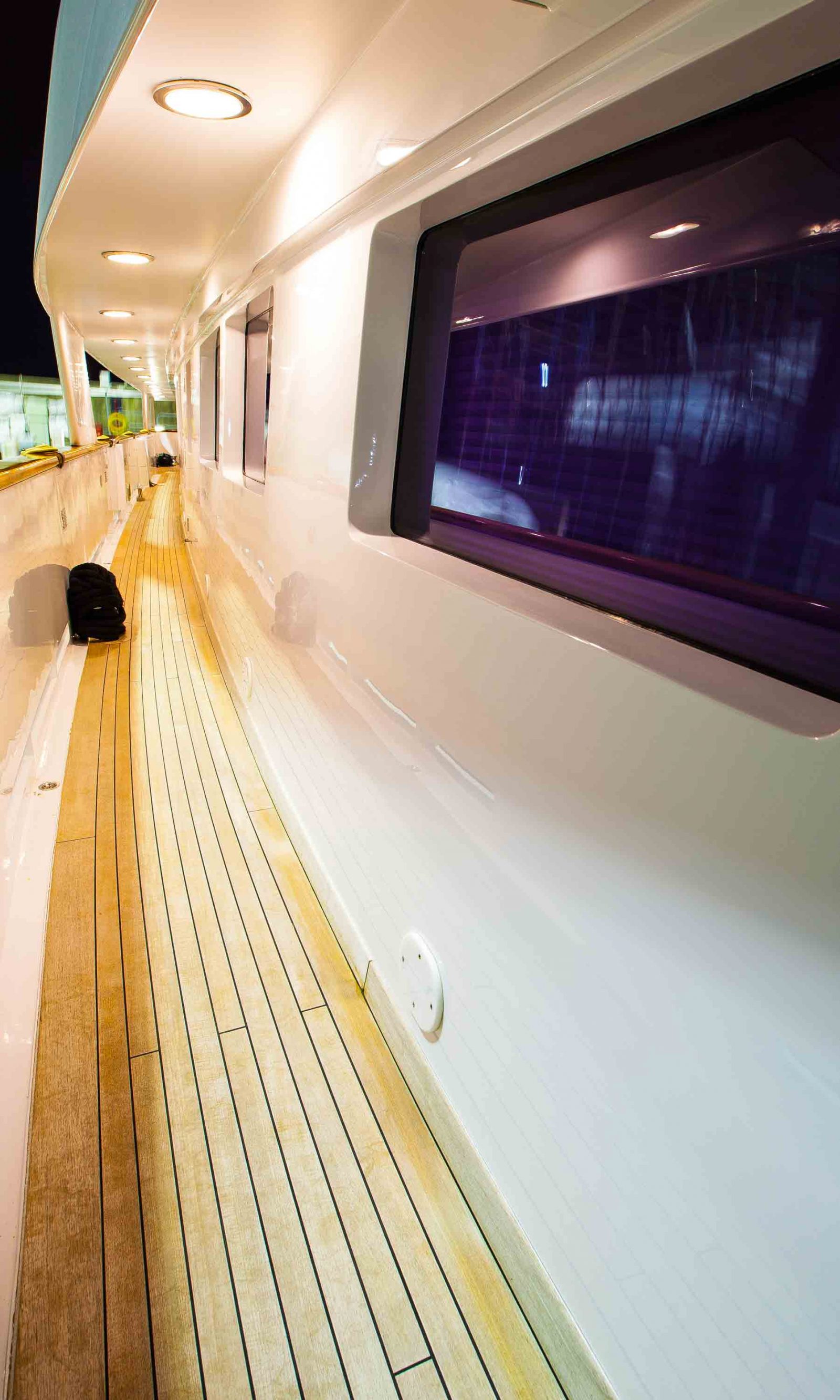 The main deck aft has outdoor armchairs and a coffee table and is fitted with strong lighting for outdoor lounging at any time of the day.