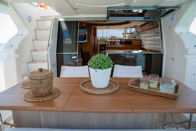 The Ferretti yacht ANANAS has generous exterior living, laid over 2 levels, this includes a shaded aft deck with alfresco dining, a raised sun pad on the bow, as well as a well-appointed sundeck, complete with dining, sunning and seating.