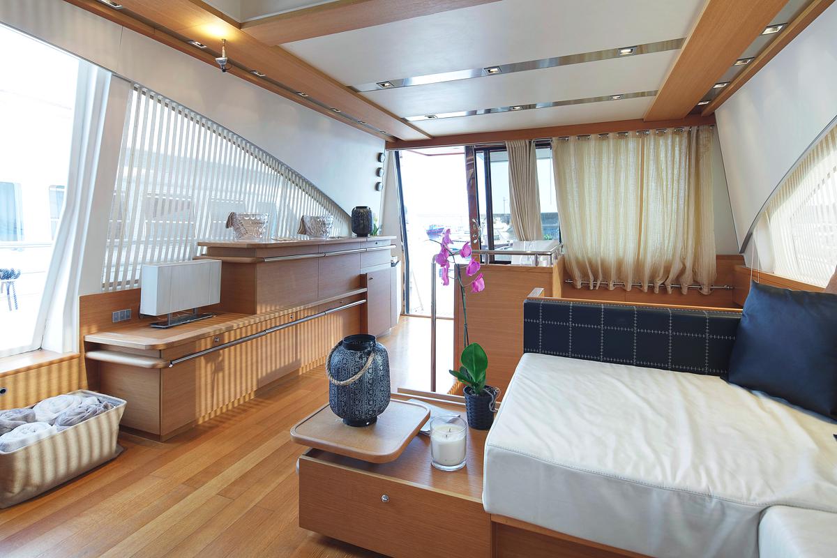 Her contemporary salon is bright and airy, filled with natural light. She boasts an overhead moonroof panel that retracts hydraulically, enabling one to enjoy the sun and starry sky from the comfort of the large sofa and fold in bed.
