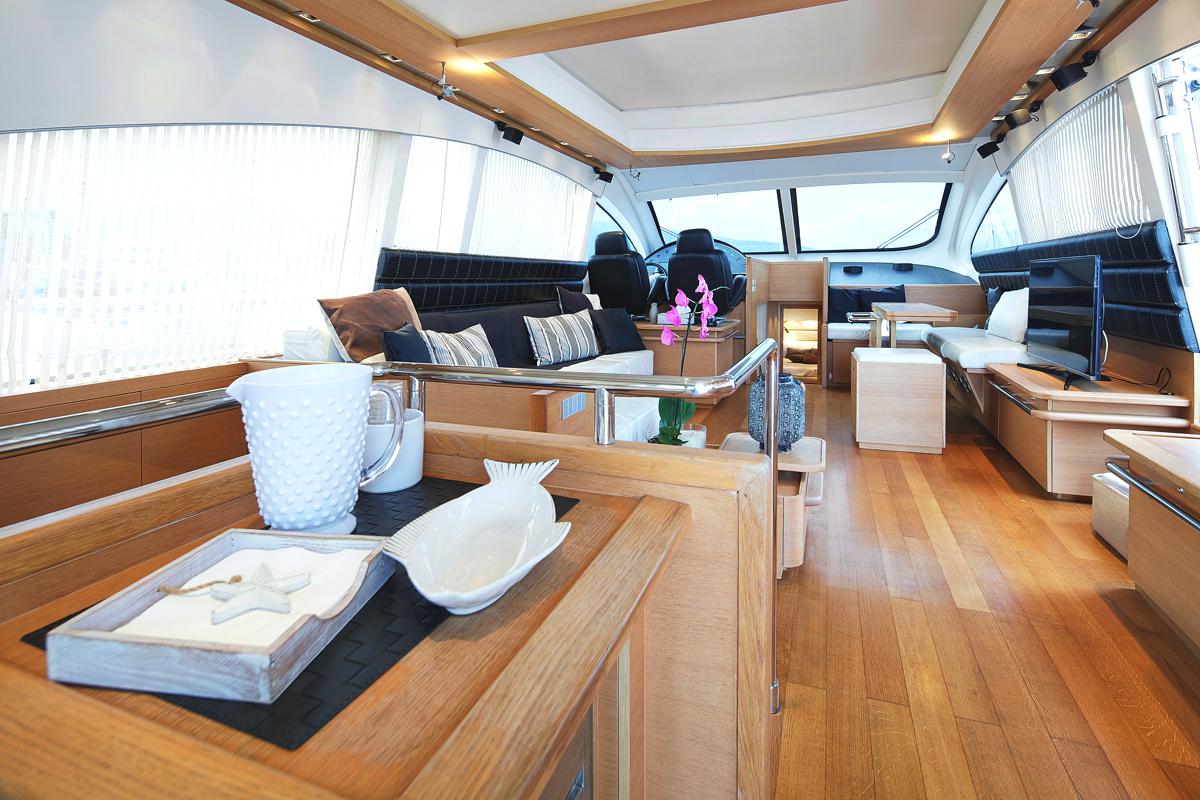 Her contemporary salon is bright and airy, filled with natural light. She boasts an overhead moonroof panel that retracts hydraulically, enabling one to enjoy the sun and starry sky from the comfort of the large sofa and fold in bed.