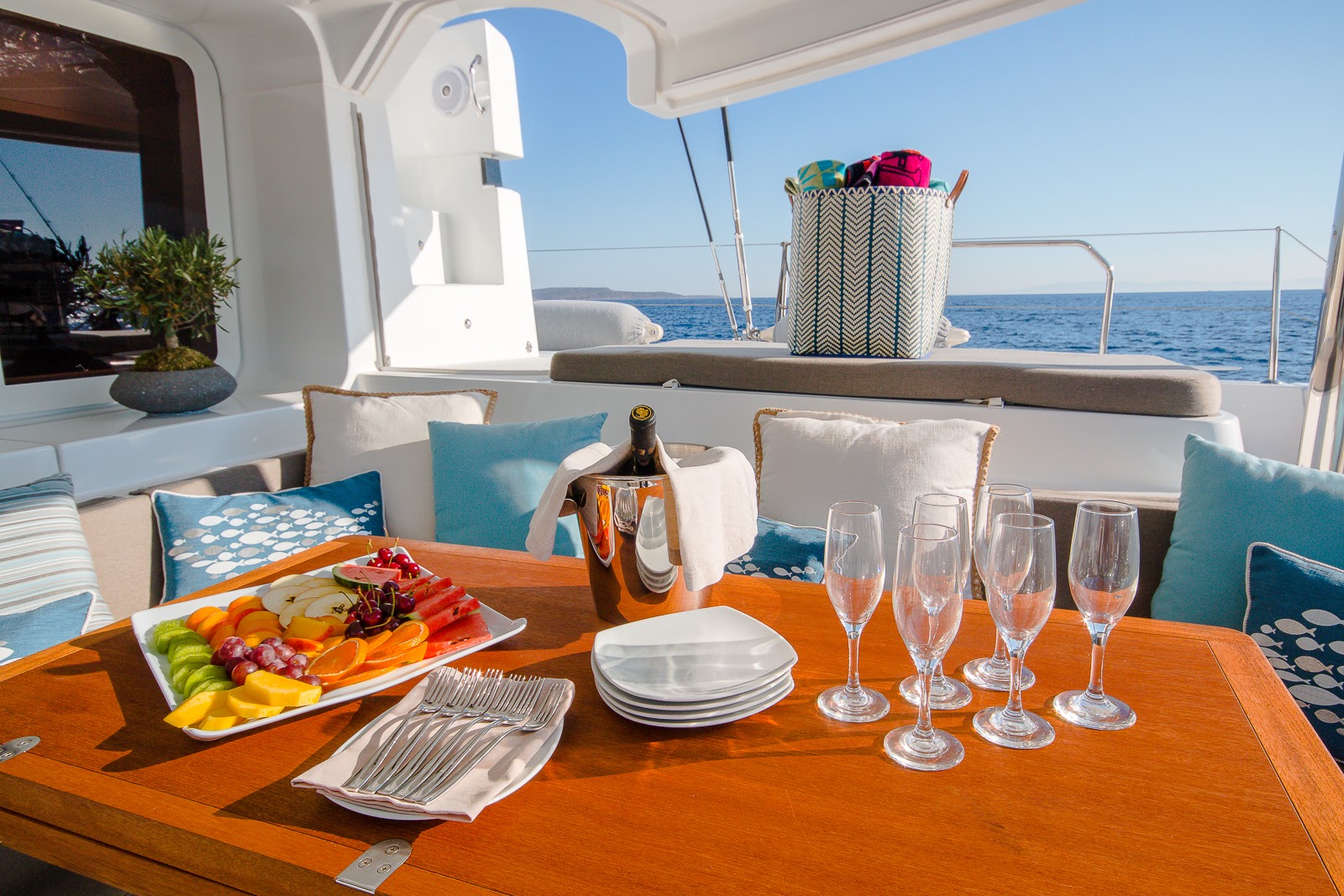 The foredeck is fitted with a spongy seating area and two trampolines provide an area to exercise, sunbathe and take in the views.