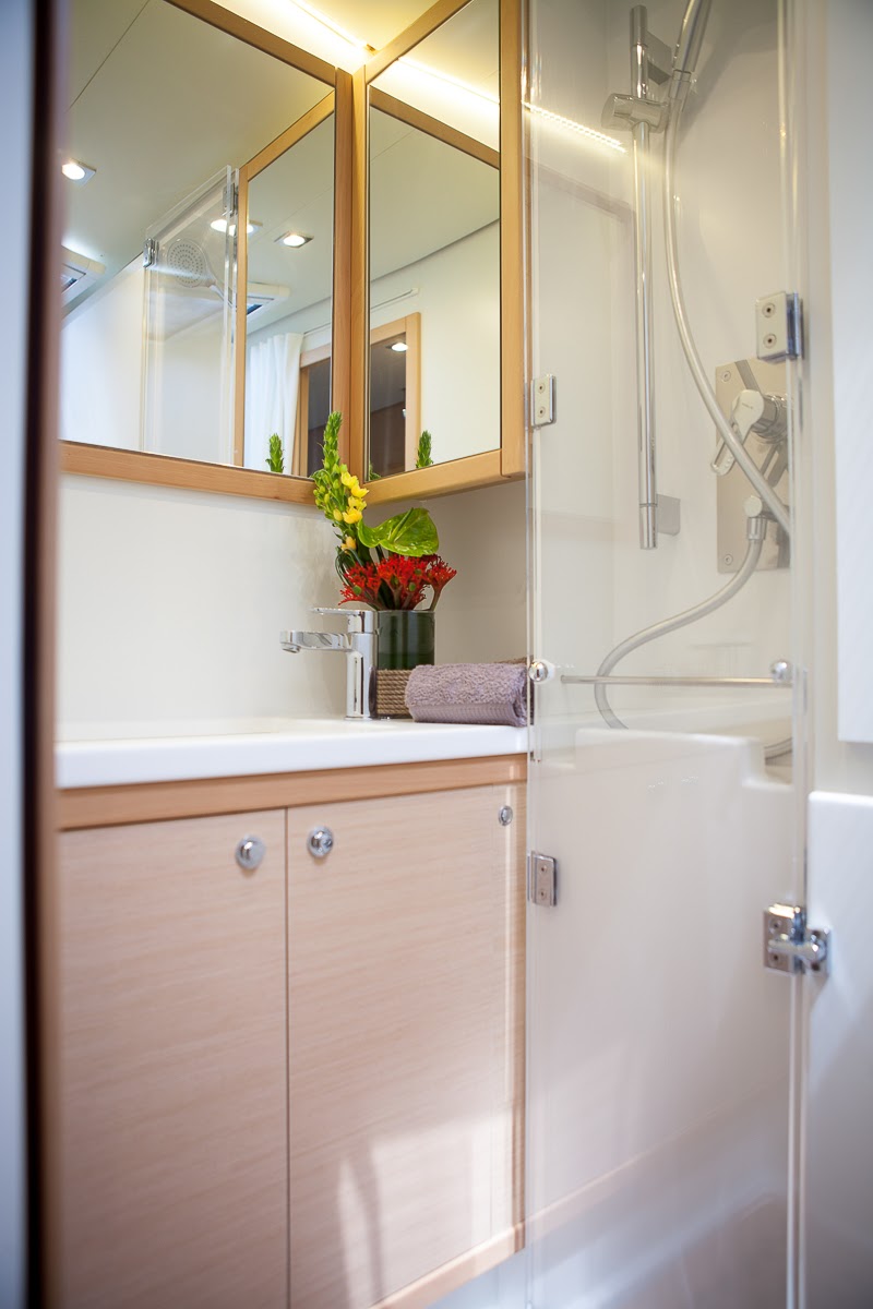The central salon places the helm station forward, with the galley to port and the corner sofa and a raised table.