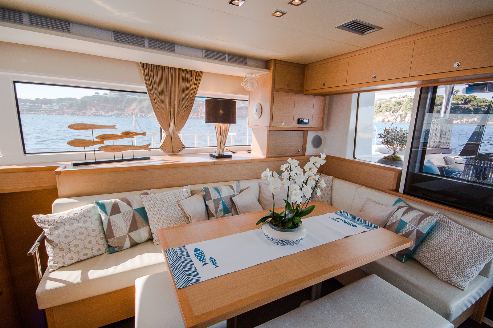 A sun pad is placed above the alfresco dining area with an additional double sunpad is placed opposite, and a canvas can be drawn down to offer protection in strong breezes.