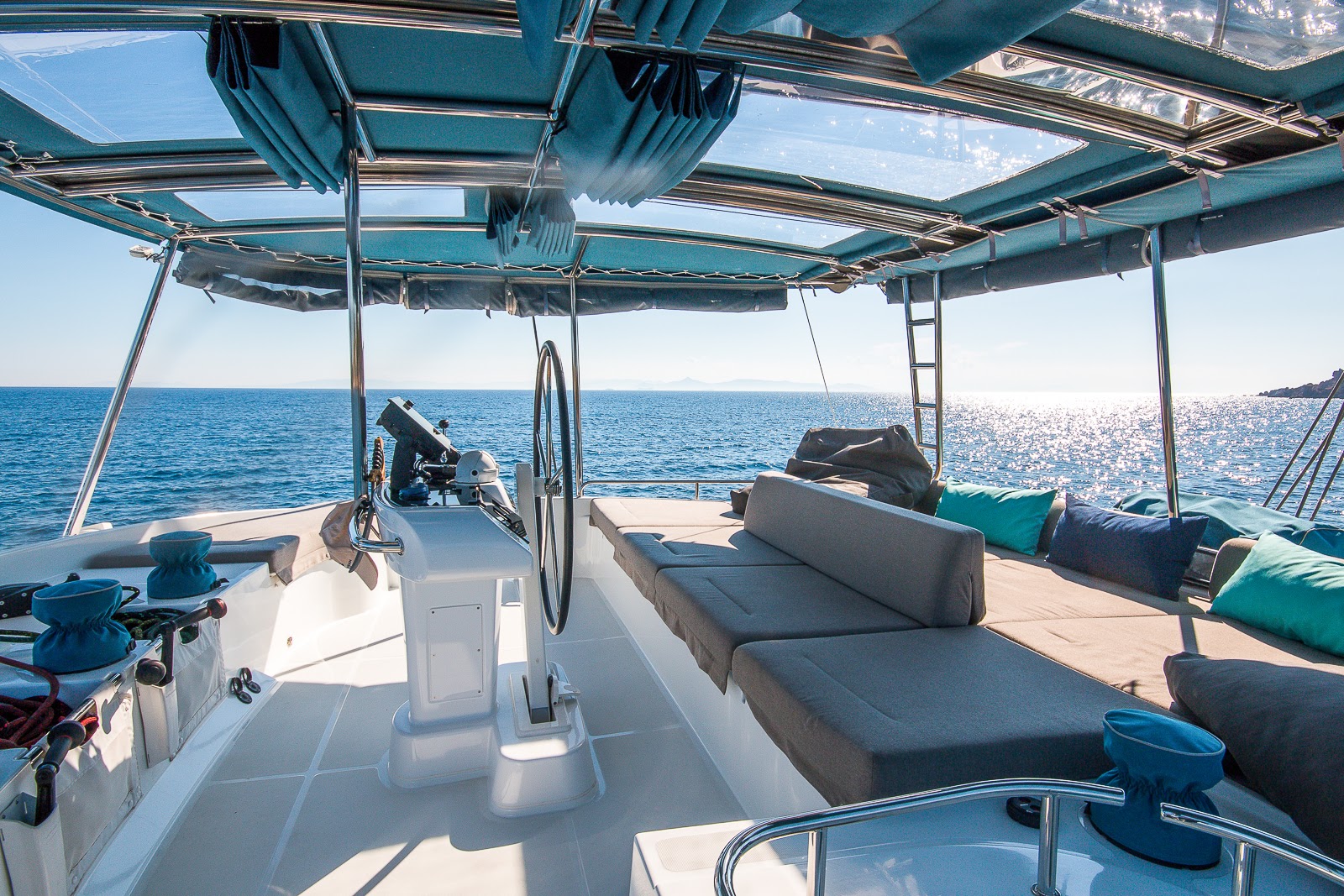 The foredeck is fitted with a spongy seating area and two trampolines provide an area to exercise, sunbathe and take in the views.