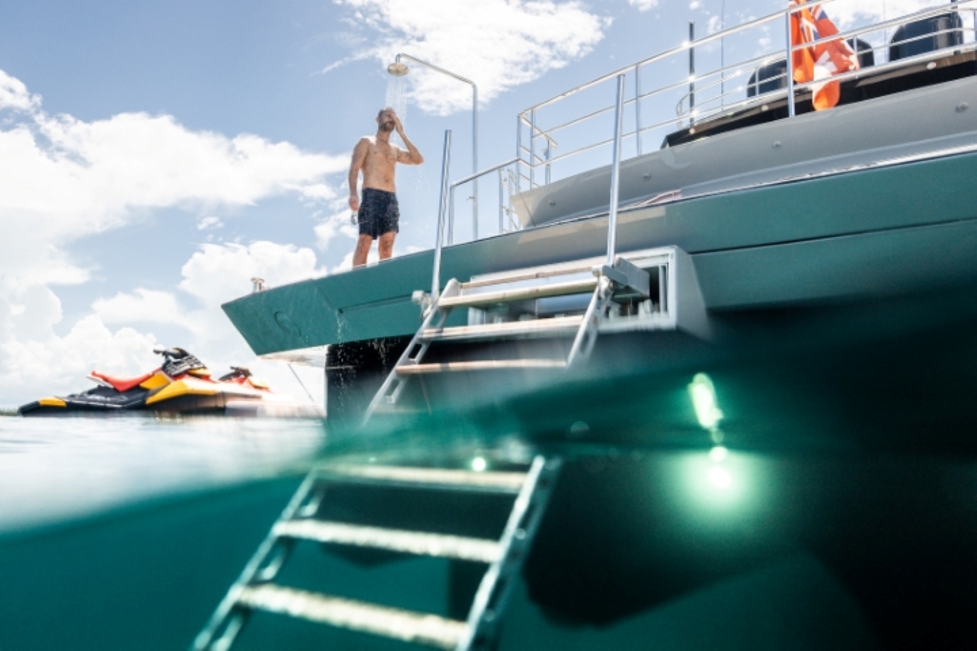 The ambience is modern, yet elegant with a timeless Italian vibe. Throughout the yacht's fine interiors ebony and leather panels, smooth granite and marble surfaces and unique onyx with backlighting have been used, creating a truly sumptuous feel.