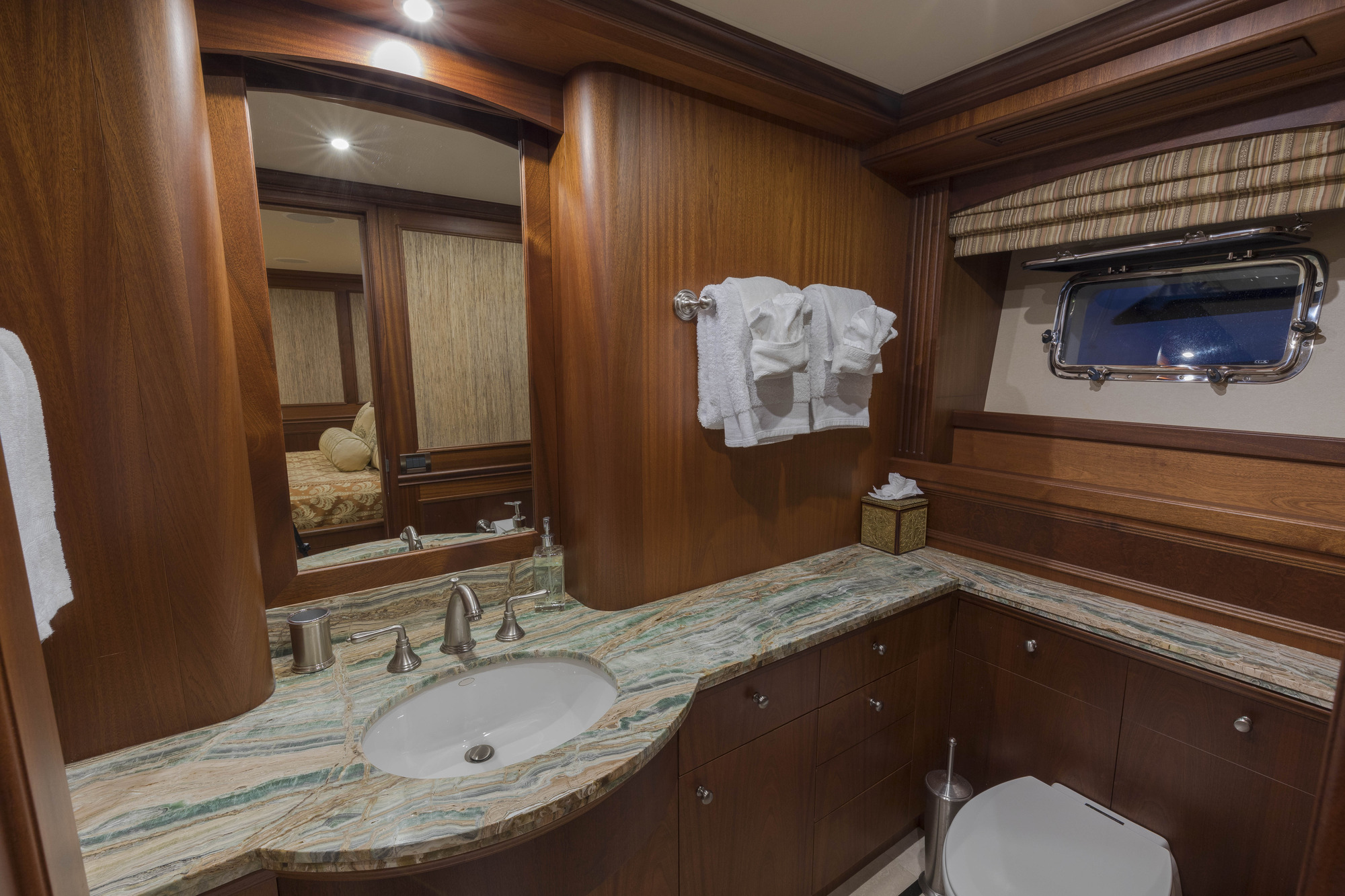 Further forward is the generous galley featuring astounding views forward. It features granite countertops and a functional island, as well as raised informal dining, with a custom wood table and comfortable seating facing aft.