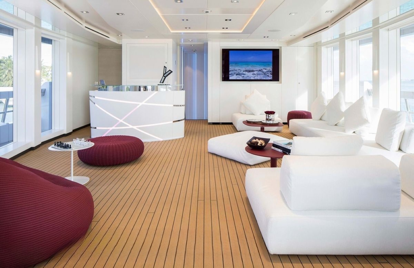 On the main deck of the luxury motor yacht Home, there is a spacious main salon with comfortable seating and dining areas. The lower deck has a fully equipped gymnasium and an engine room. The sundeck is a fantastic area for unwinding and leisure: there are a large wet bar and a spa pool for the guests to enjoy luxury cruising to the fullest.