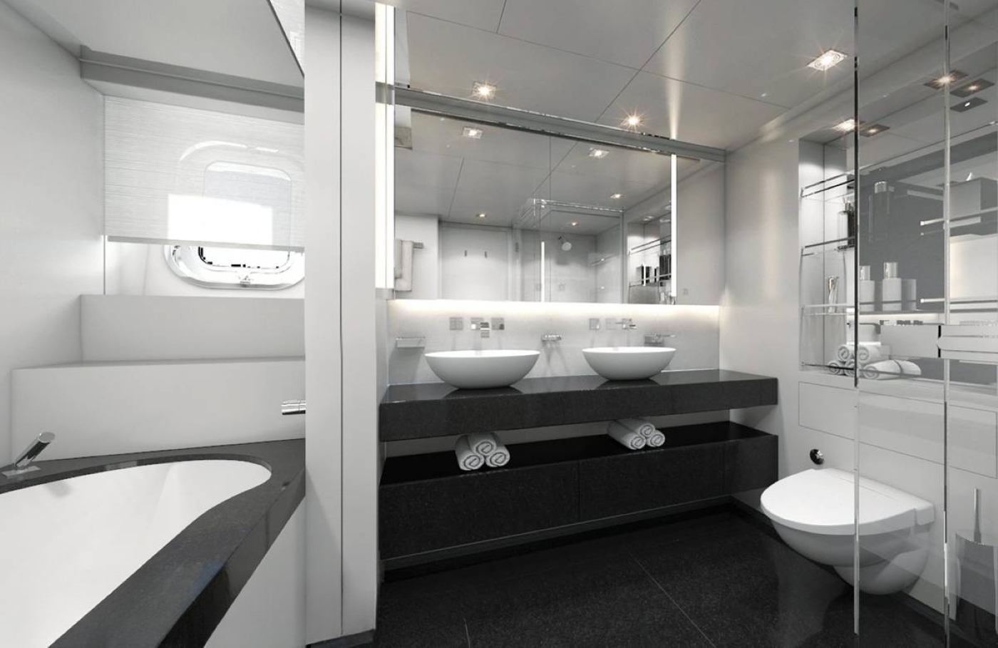 These include the main deck master suite, featuring a bathroom with central bathtub. The lower deck hosts the additional guest cabins. There is a forward, full-beam VIP suite with a spacious bathroom with bathtub, two twin cabins located amidships, as well as two double cabins aft, both equipped with ensuite shower rooms.