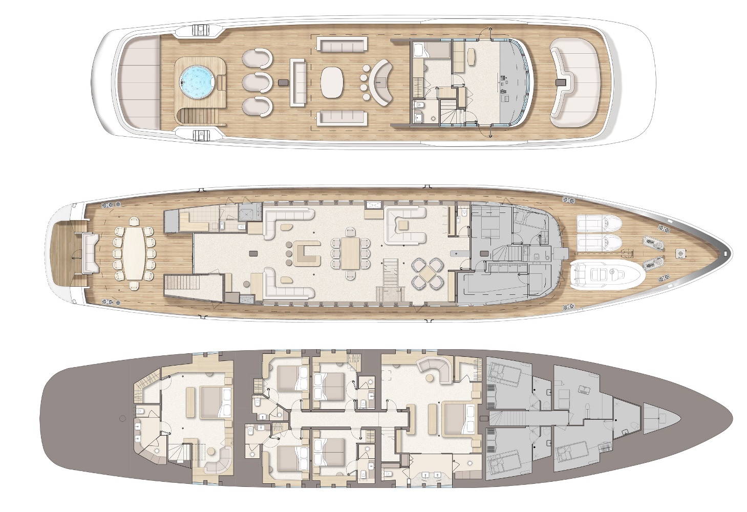 The VIP cabin is aft of the yacht and also boasts a full beam layout, king size bed, lounge, walk in wardrobe and ensuite with dual sinks. Two cabins each have queen beds, while a further 2 cabins offer twin beds. The 2 twin cabins are convertible to queen cabins, making the layout extremely versatile and suitable for any group.