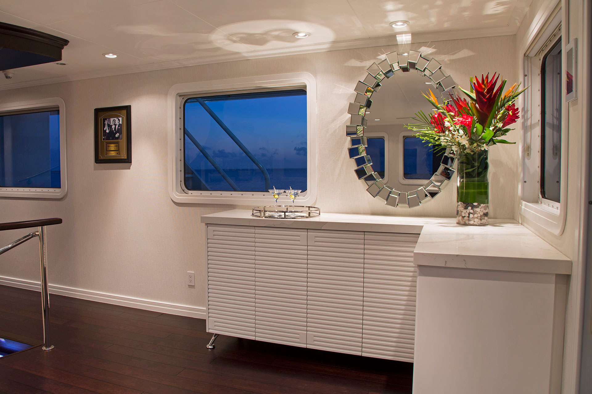 The main salon has a lovely lounge with comfortable seating, full bar, game table, day head, and media center.