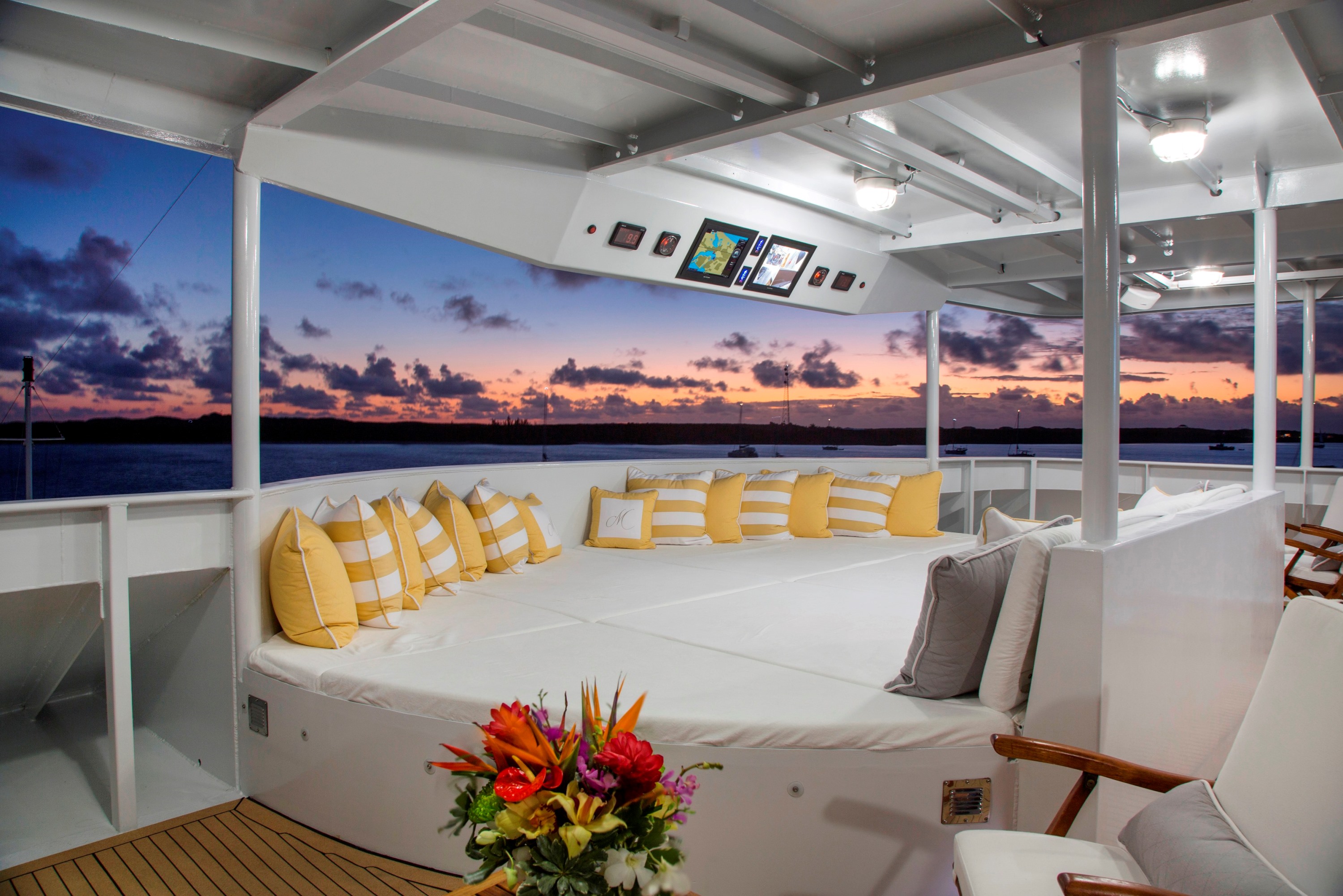 The redesigned sundeck features a large observation area with sun pads, perfect for sunbathing and admiring beautiful views. Guests will also enjoy the spa pool and full-service bar while cruising in the warm waters in the best yachting destinations.