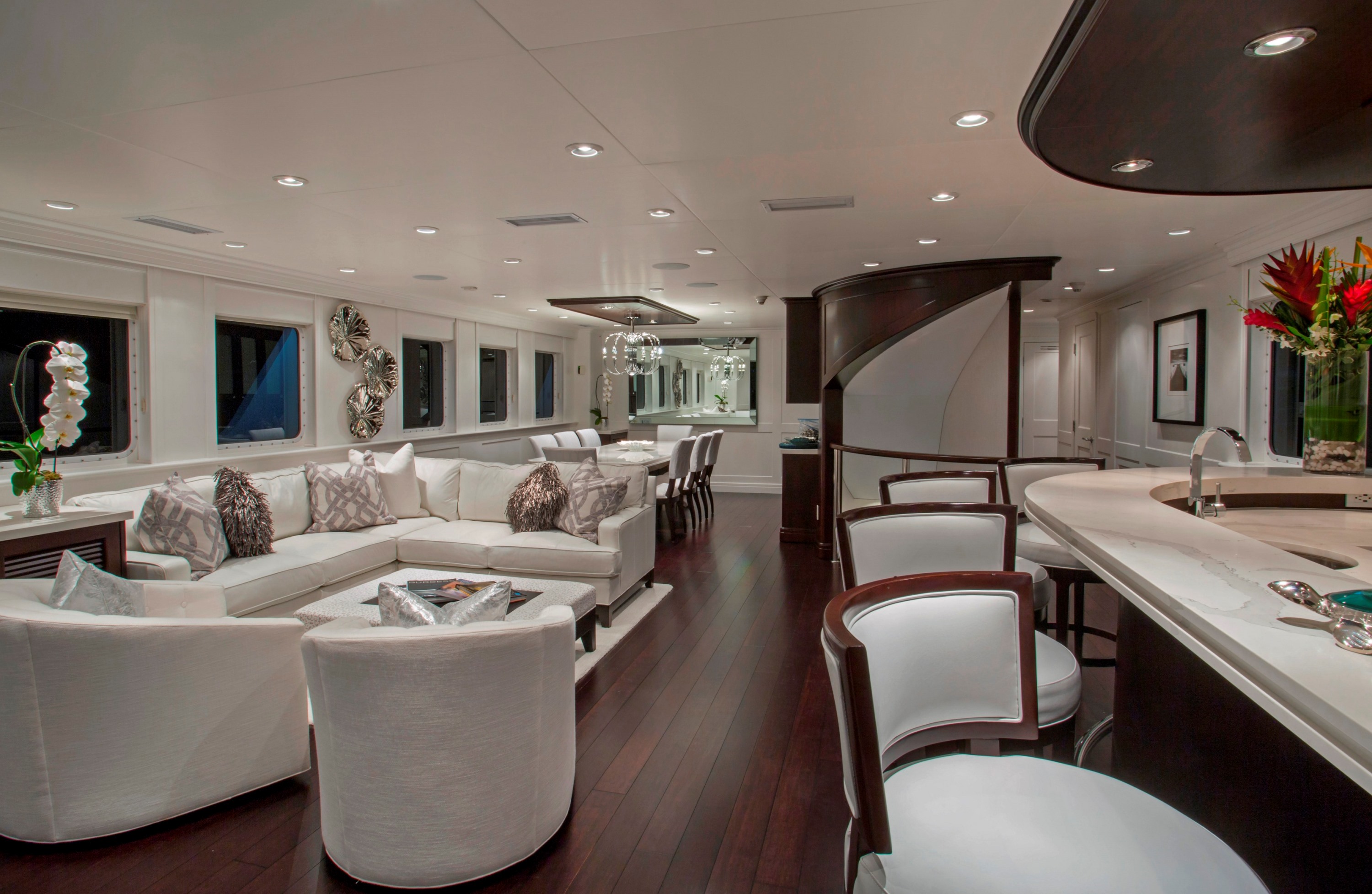 The main salon has a lovely lounge with comfortable seating, full bar, game table, day head, and media center.