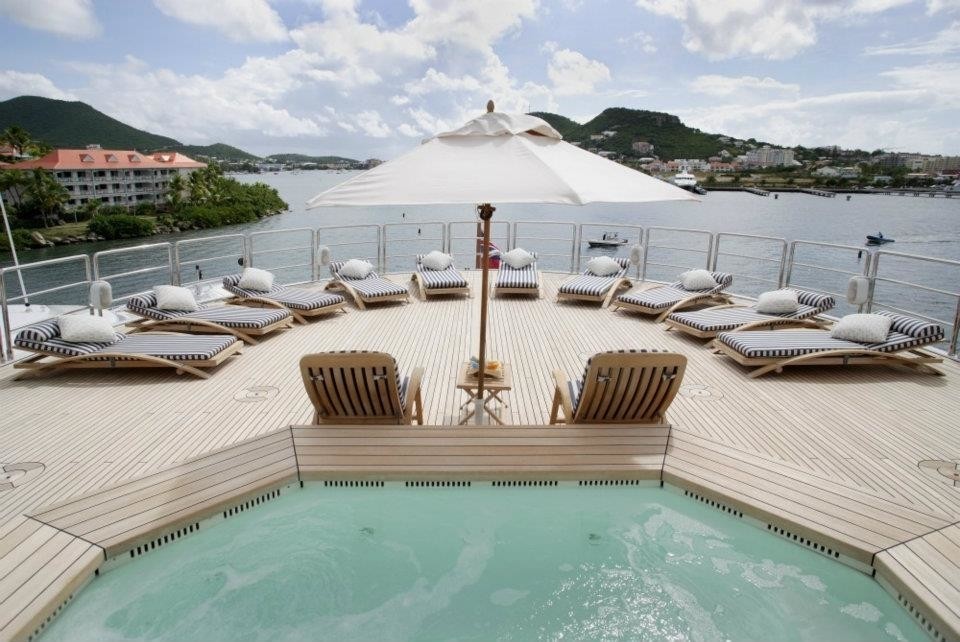 Jacuzzi Pool With Sunshine Lounging On Board Yacht FREEDOM