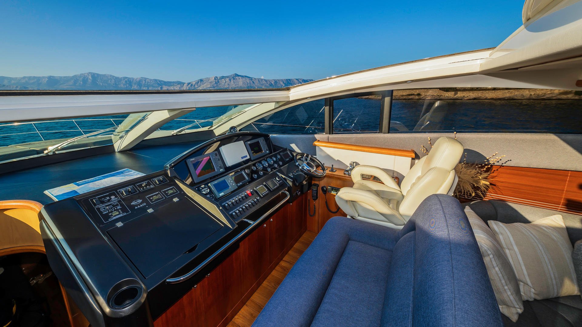 Her open plan salon is open right out onto the aft deck, it offers a comfortable lounge with a convertible dining table, surrounded by windows and an overhead retractable roof.
