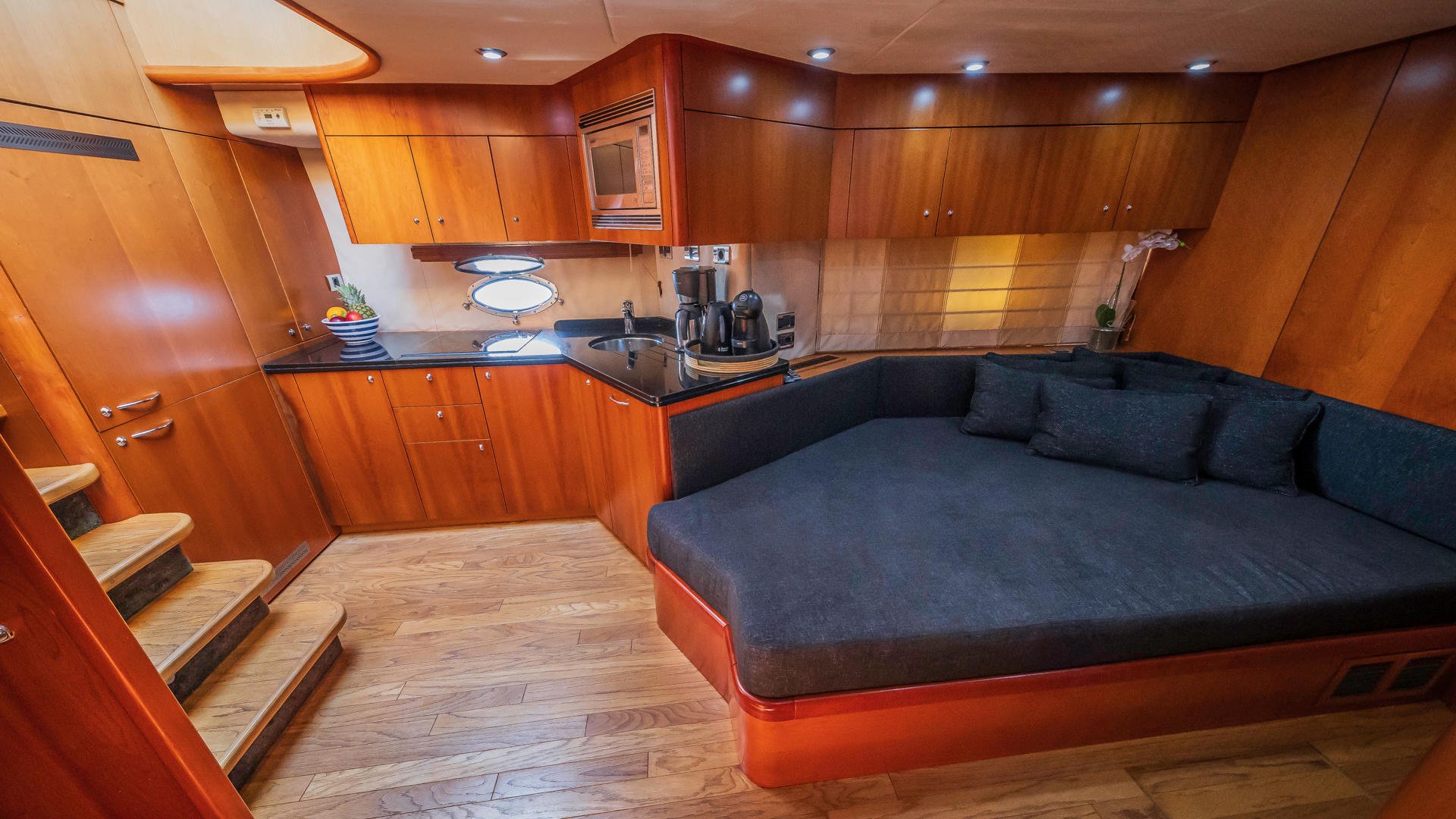 Her open plan salon is open right out onto the aft deck, it offers a comfortable lounge with a convertible dining table, surrounded by windows and an overhead retractable roof.