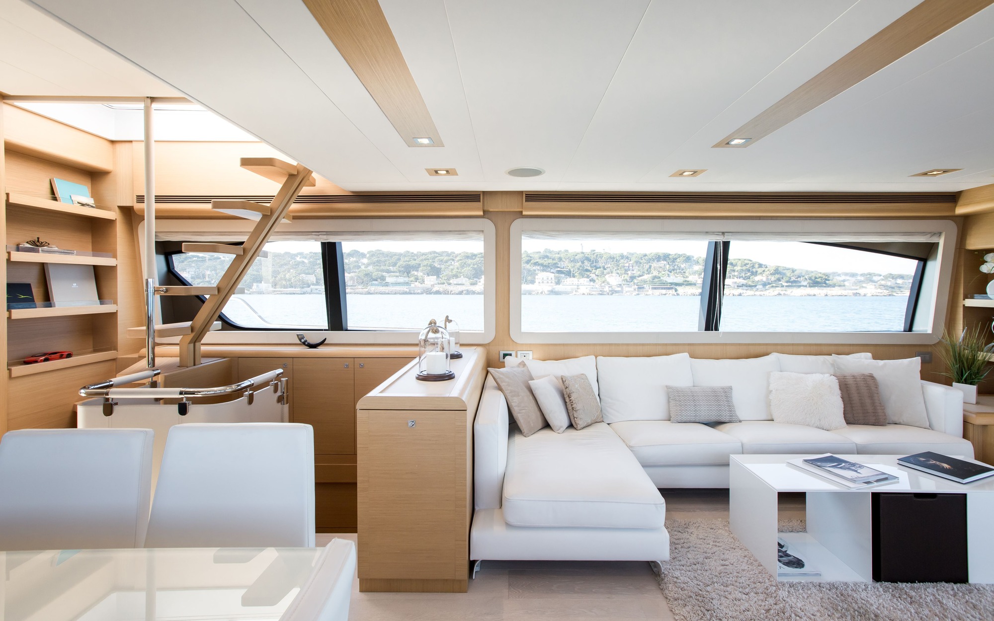 The yacht's interior is contemporary and spacious, with neutral soft furnishings and light woods throughout.