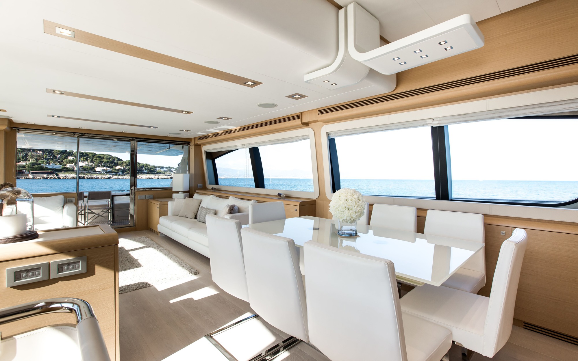 The yacht's interior is contemporary and spacious, with neutral soft furnishings and light woods throughout.