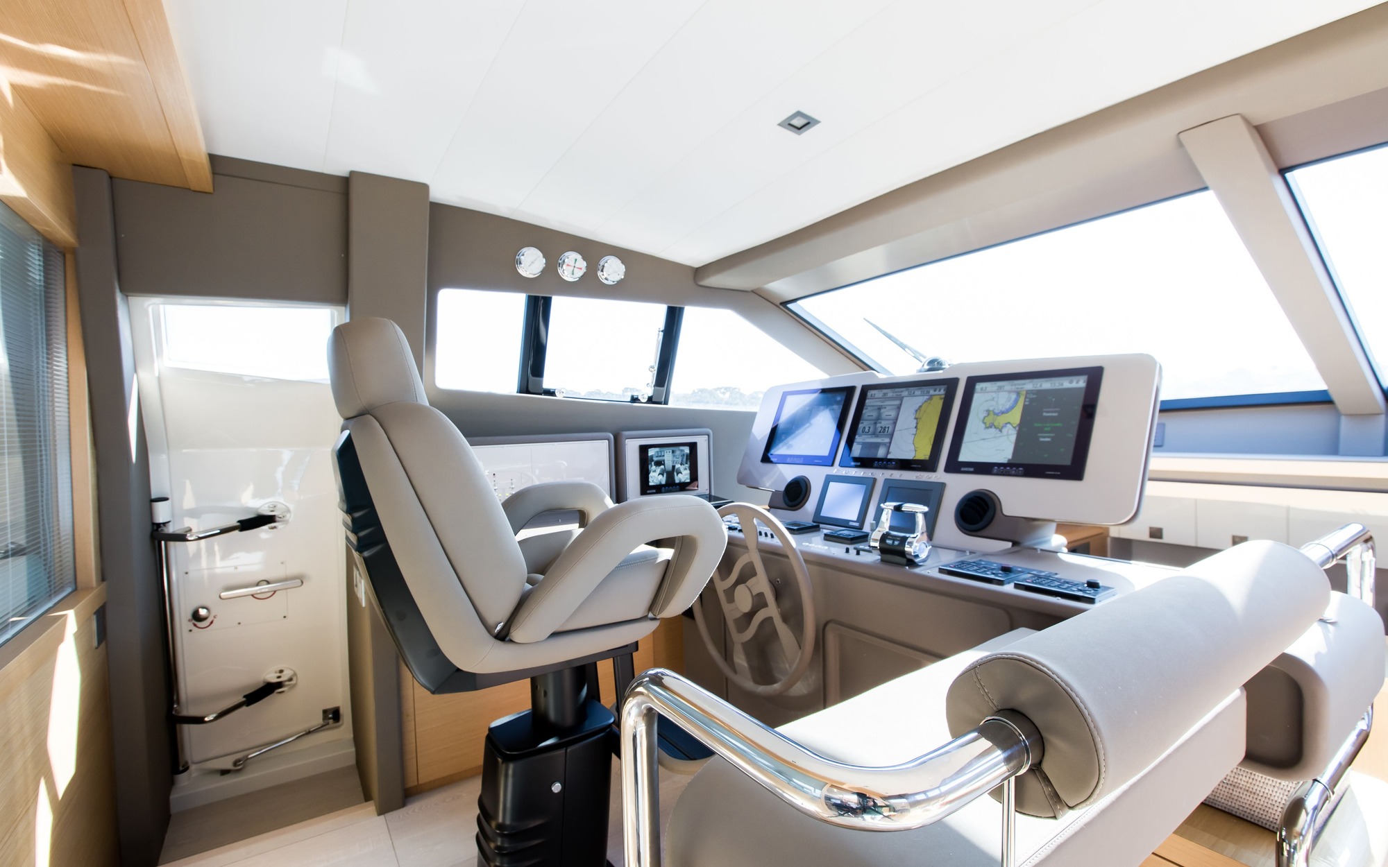 With panoramic side windows, sliding glass doors aft and forward facing helm station, the salon and dining area receives ample natural light. Accommodation is on the lower deck in 1 master, 1 VIP, 1 double and 1 twin bunk cabin, all boasting private ensuites.
