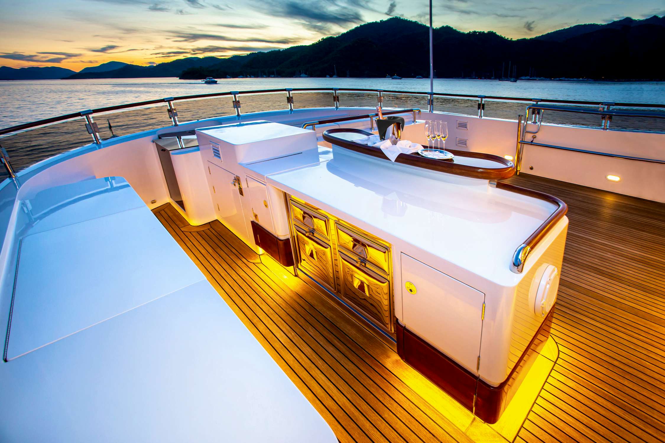 The main deck provides a generous salon with plush furnishings and large panoramic windows, providing spectacular views and plenty of natural light. Separate and forward of the salon is the formal dining table, lavishly seating 10 guests with ease.