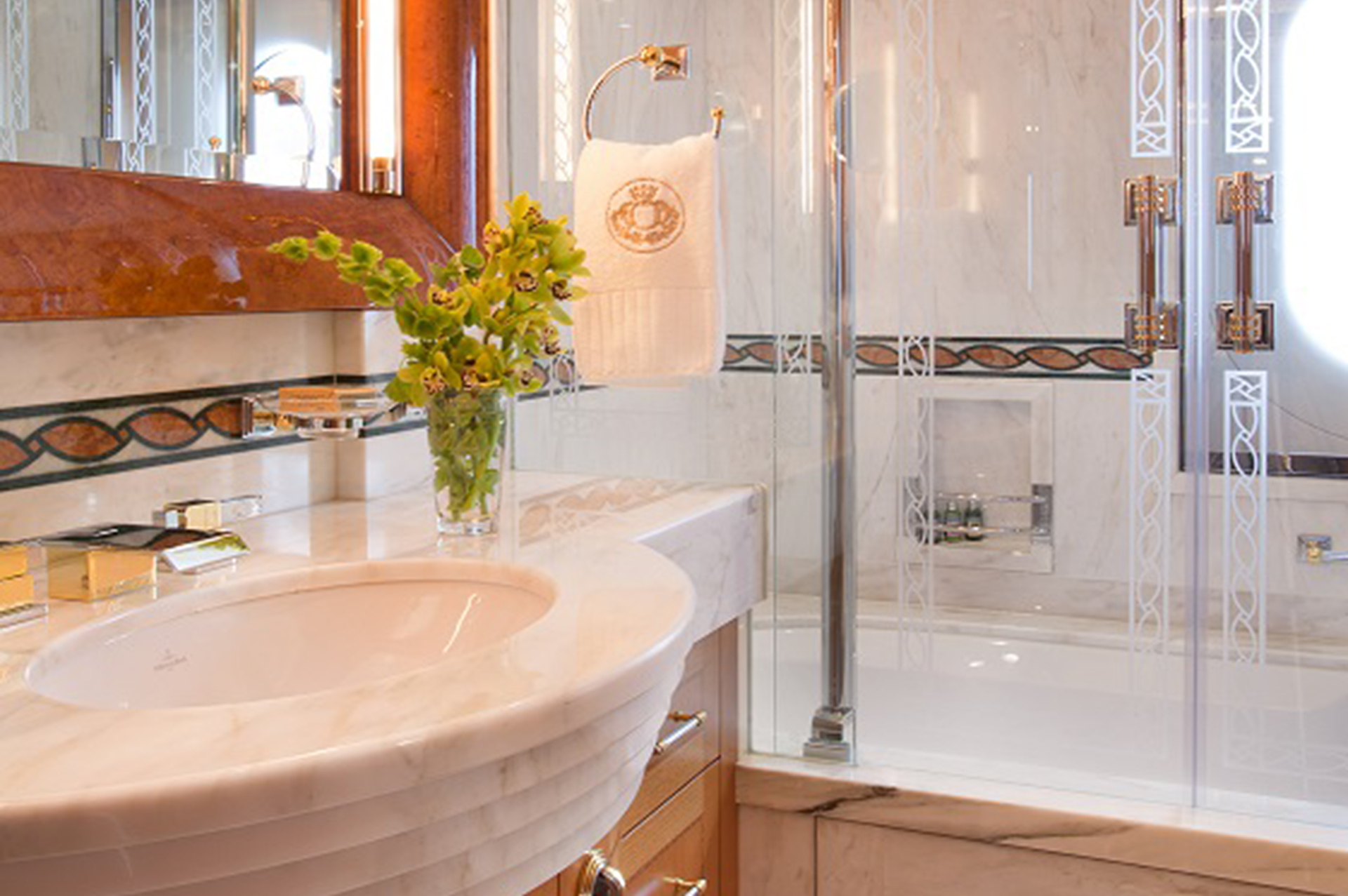 Master Stateroom is located on the main deck and features a king bed, ensuite marble bathroom with his and hers facilities, Spa Pool tub, walk-in shower, walk-in closets, annexed lounge, private office. 5.1 sound in stateroom and lounge with 50” Plasma screens, 42” Plasma in office, AMX control for all room functions incl.