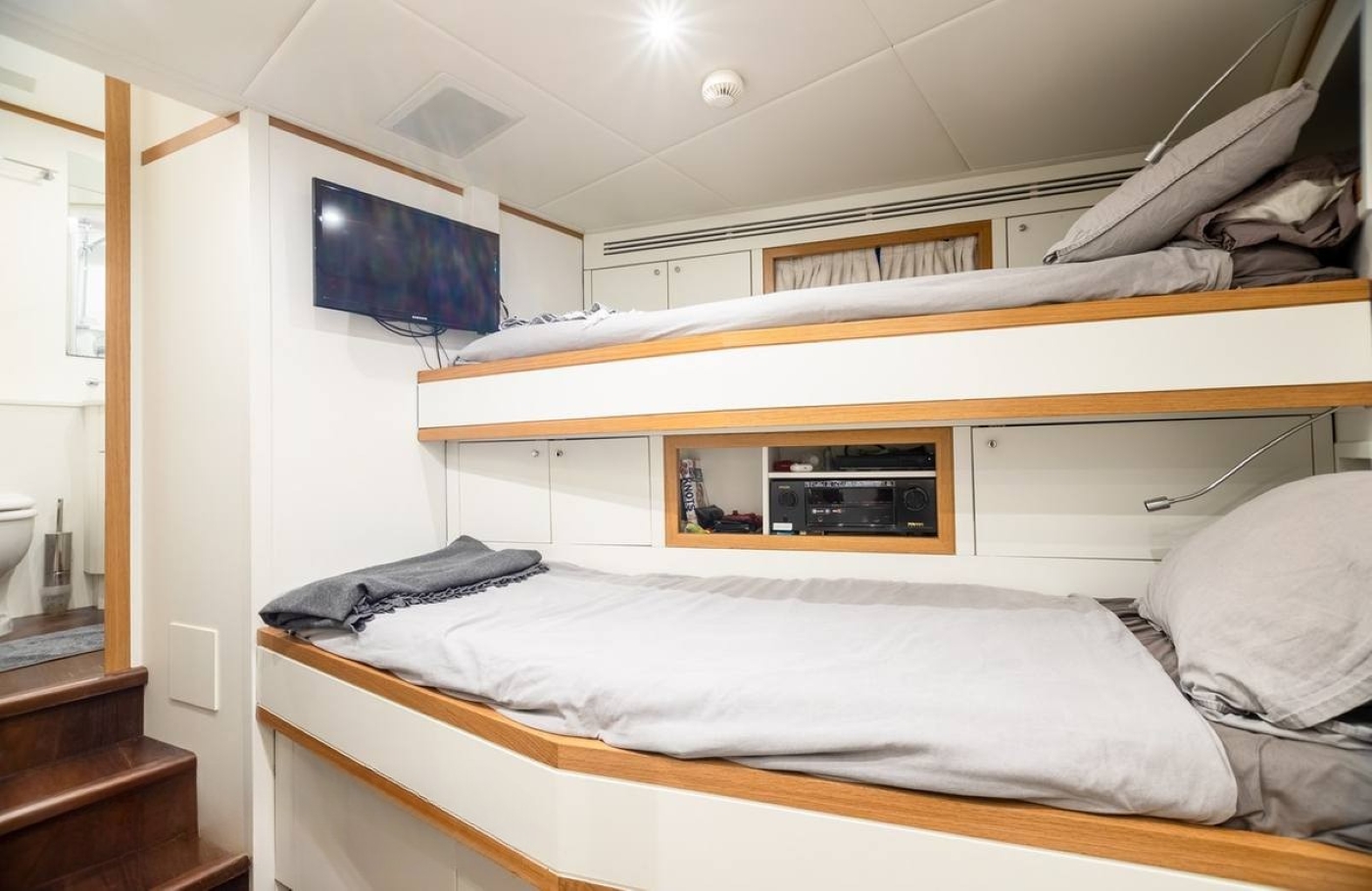 The yacht offers accommodation for up to 10 guests over a five-cabin layout with ensuite facilities. There is also a crew of 7 on board.
