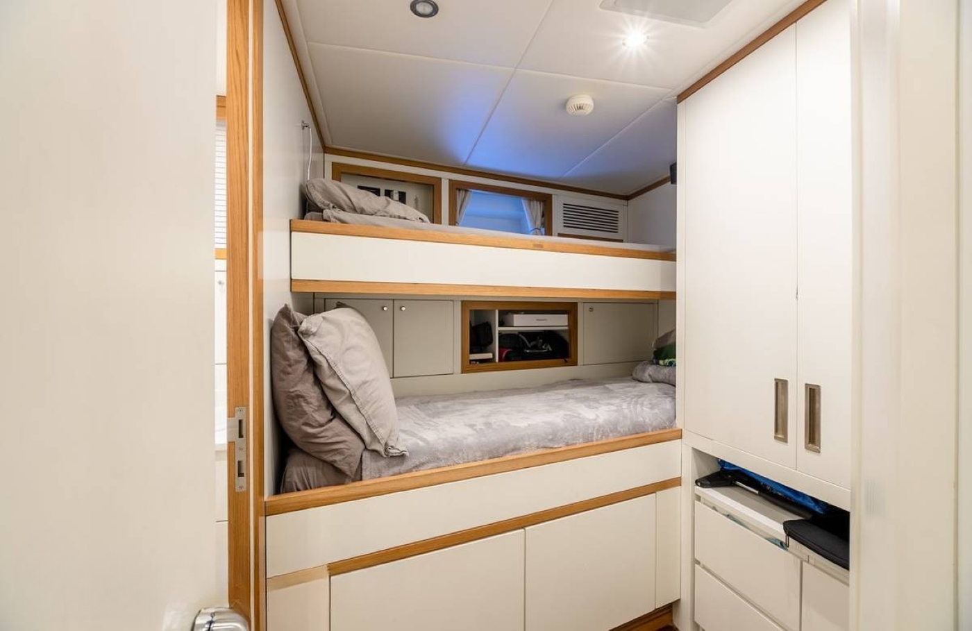 The yacht offers accommodation for up to 10 guests over a five-cabin layout with ensuite facilities. There is also a crew of 7 on board.