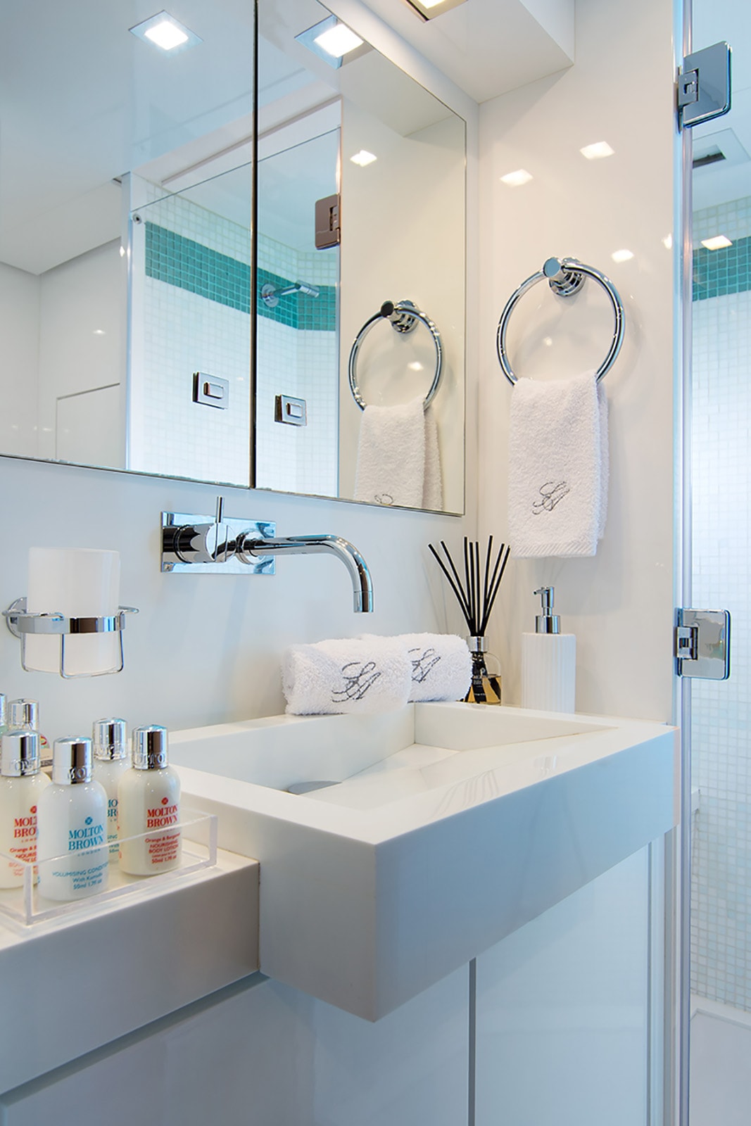 Her master suite is full beam of the yacht and offers a Queen Size bed, with a settee and private ensuite facilities. Her two other double cabins also boast Queen Size beds and are very spacious with lots of storage space. There is an additional twin cabin, with two singles side by side.