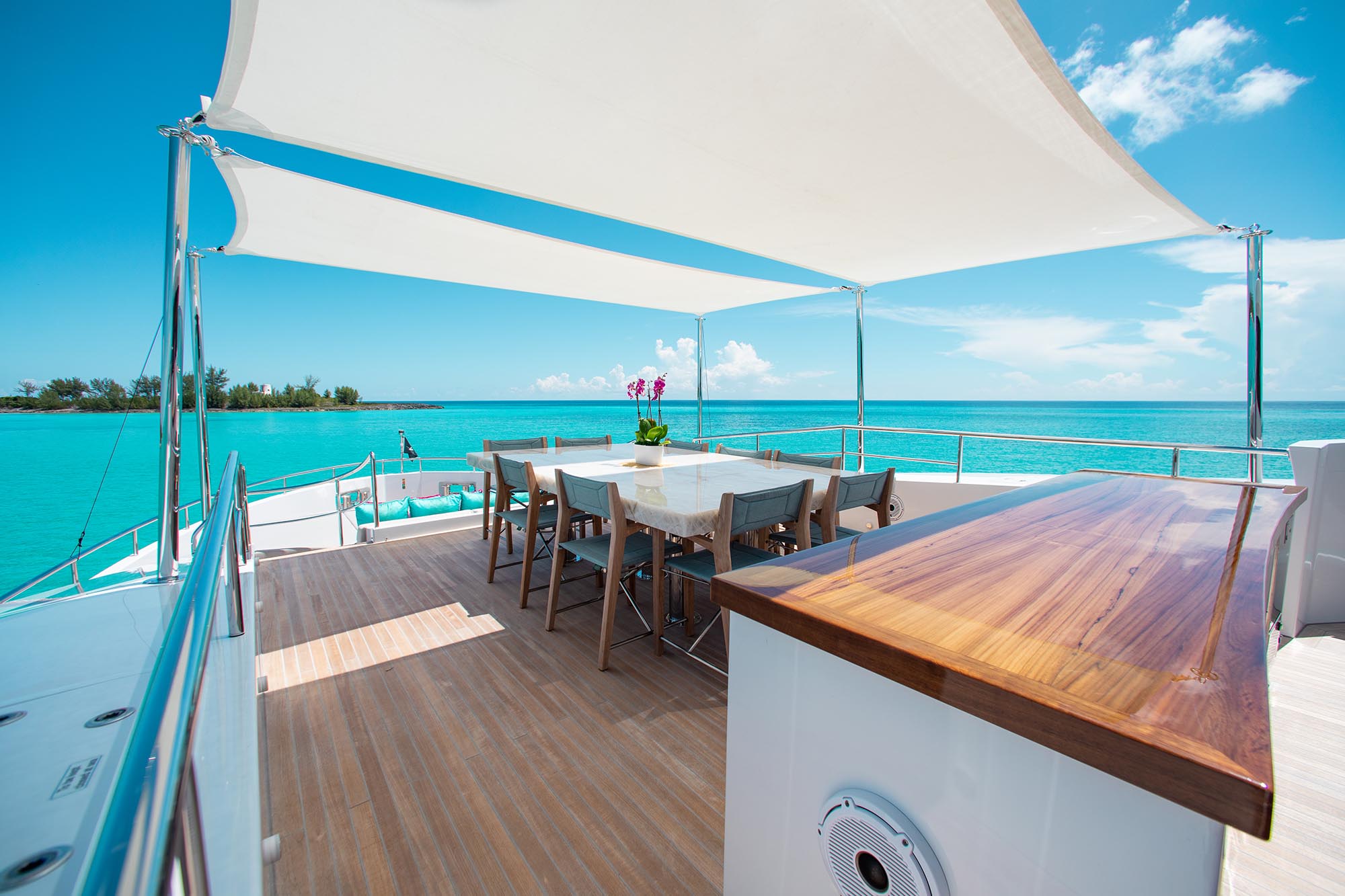 Enjoy ample seating as well as a formal al fresco dining area located on the upper deck. This provides a spectacular viewpoint from which to admire the changing scenery. There is also a secondary dining area on the impressive bow deck.