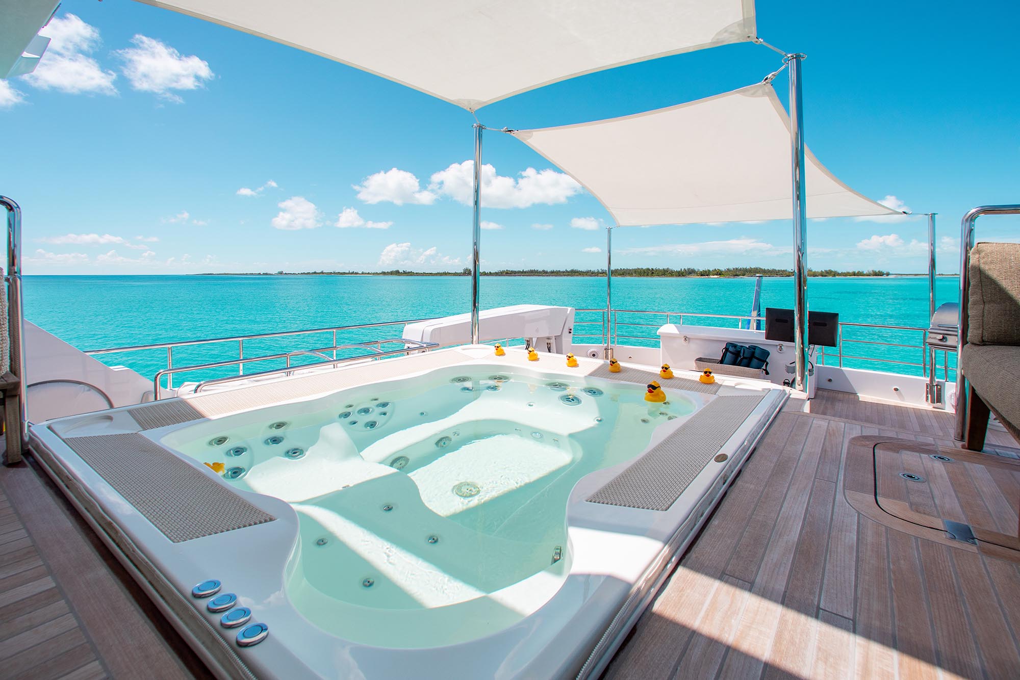Notable features for CURFEW II: vast exterior spaces - flybridge Jacuzzi - state-of-the-art entertainment system - futuristic and ...