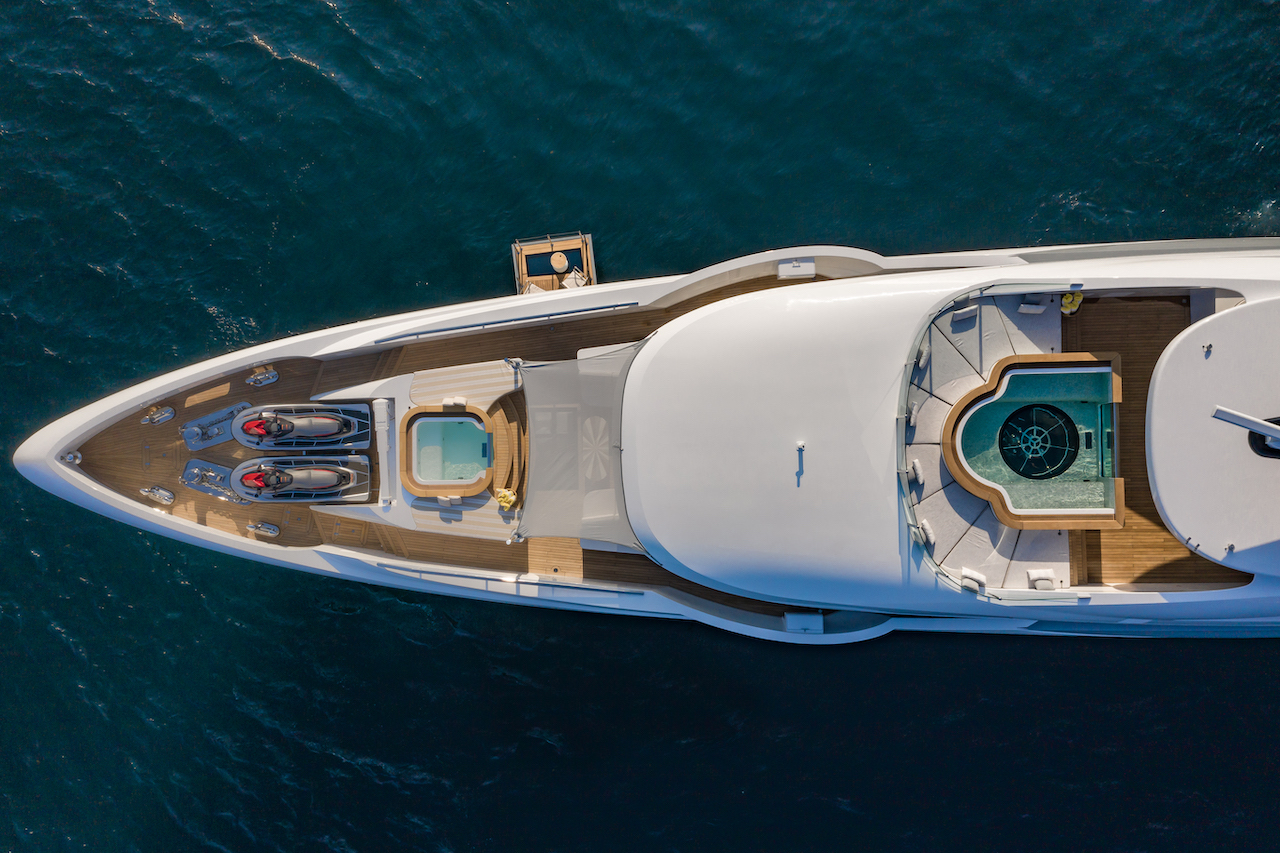 Upon the main deck aft, a large sofa lines the stern and a coffee table creates a casual space for alfresco meals and watching the world go by.