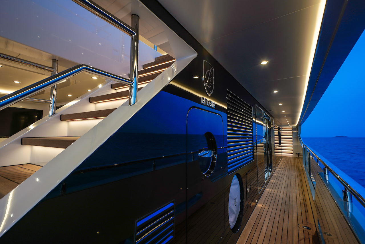 Upon the main deck aft, a large sofa lines the stern and a coffee table creates a casual space for alfresco meals and watching the world go by.