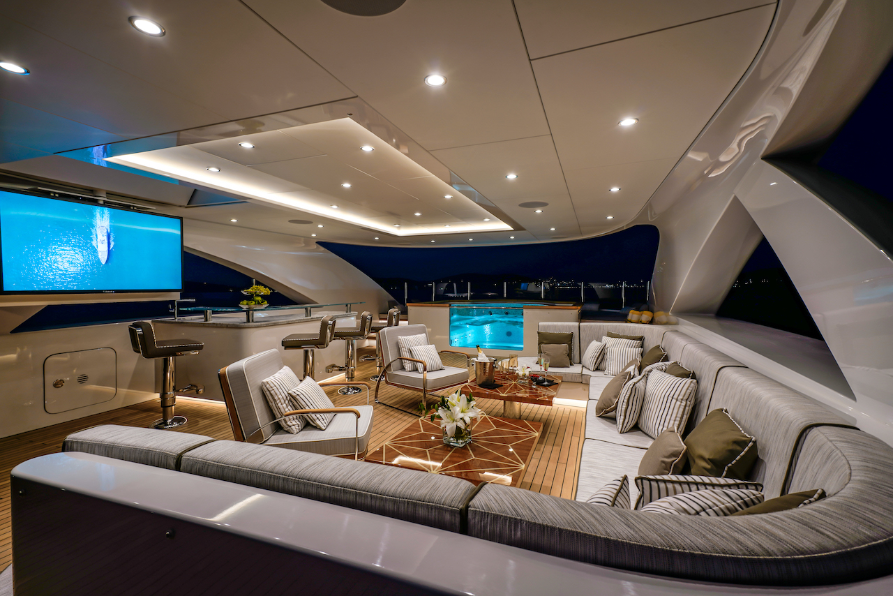 Upon the main deck aft, a large sofa lines the stern and a coffee table creates a casual space for alfresco meals and watching the world go by.