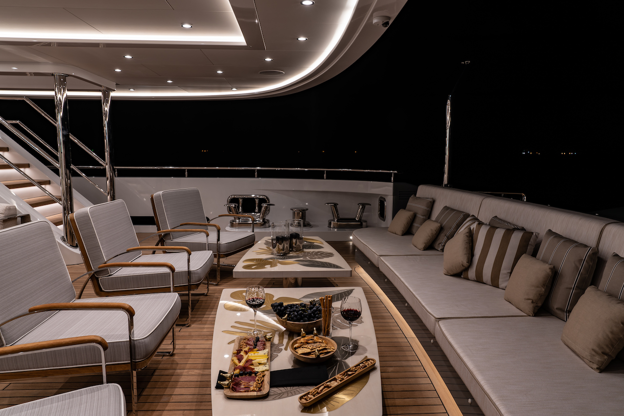 She features the naval architecture and exterior styling of Unique Yacht Design, while the interiors are the work of İlkay Dovan from the shipyard in-house team. Spanning four decks, her amenities include two Jacuzzis and a wet bar as well as numerous alfresco dining and lounging areas.
