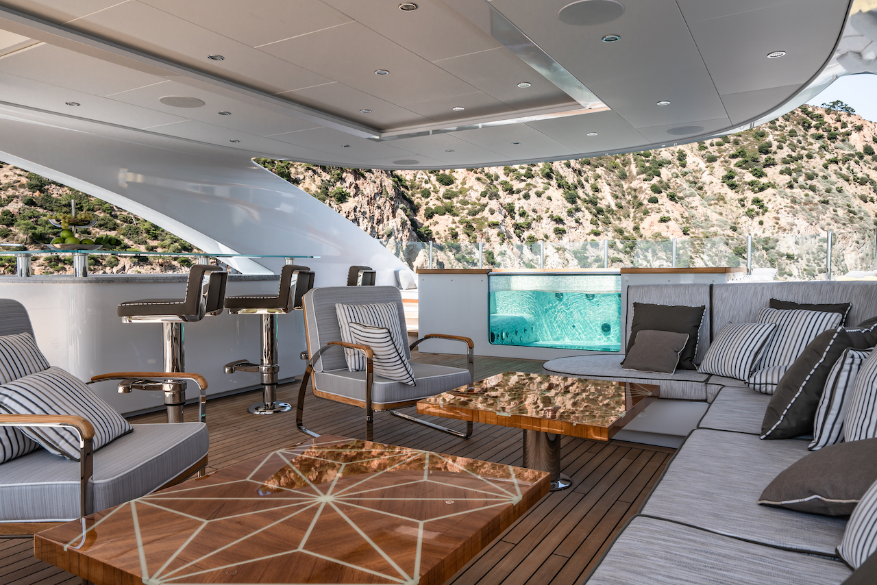 Upon the main deck aft, a large sofa lines the stern and a coffee table creates a casual space for alfresco meals and watching the world go by.