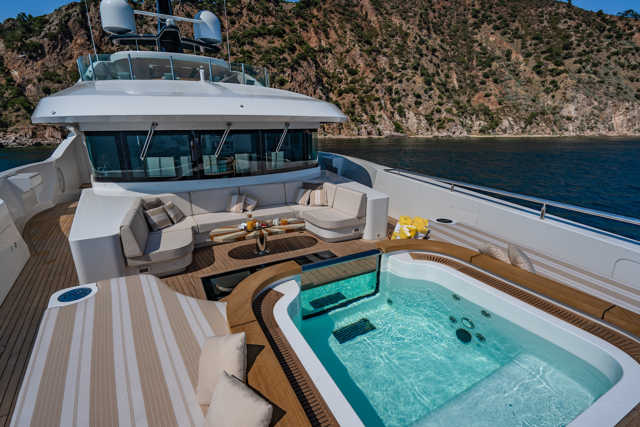 Beneath the shade of the hardtop, there is a C-shaped sofa and table for alfresco meals and a wet bar, while along the stern there is space for sun loungers to be placed out of room for a tender and a Davit ...