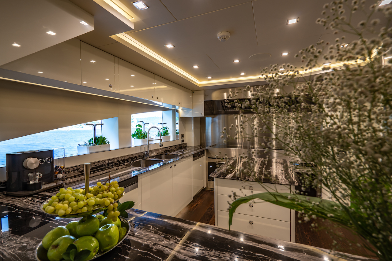 The accommodation sleeps a maximum of 10 guests over five en-suite cabins, with a crew of nine to ensure that all guests have a stellar cruising experience.