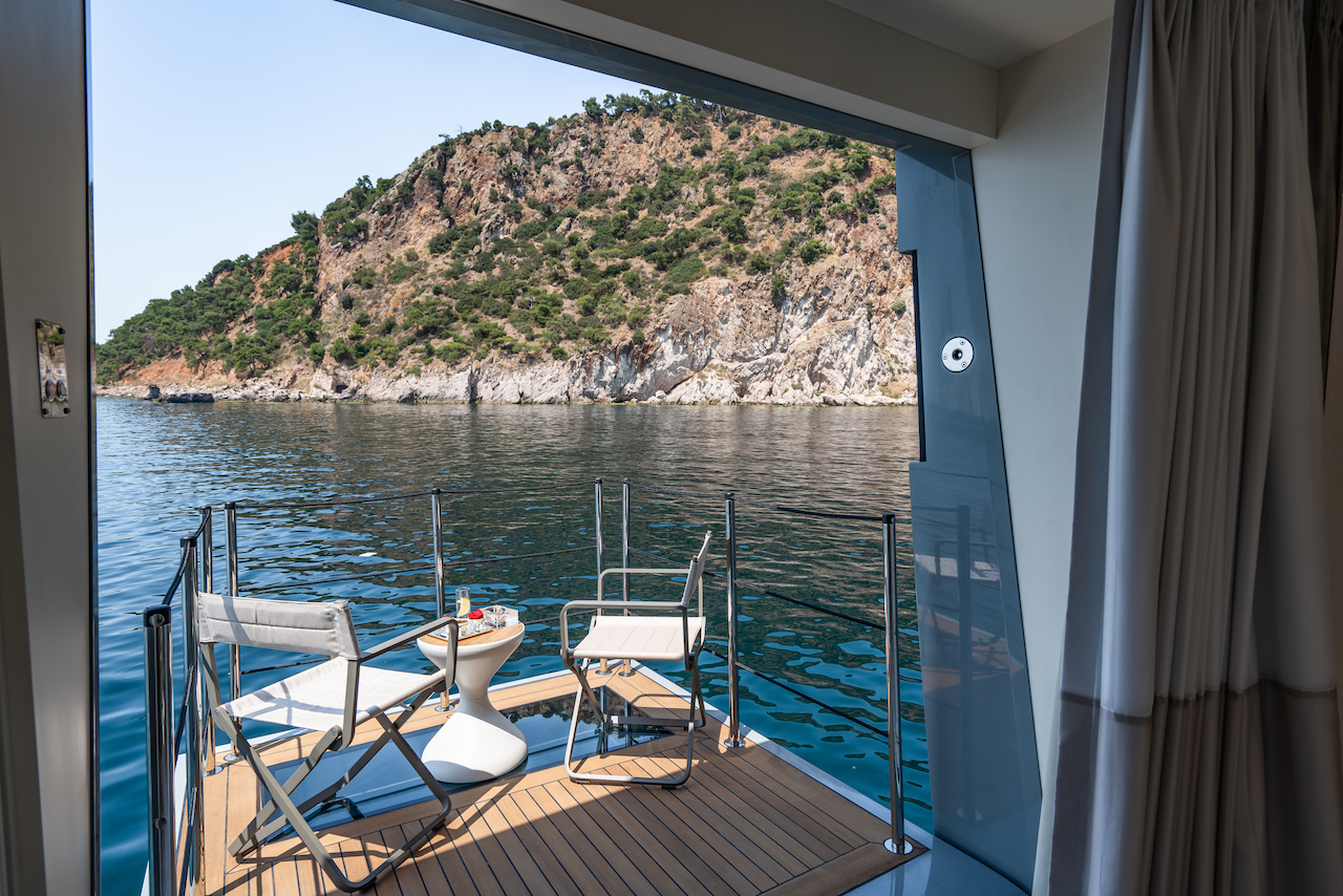 The accommodation sleeps a maximum of 10 guests over five en-suite cabins, with a crew of nine to ensure that all guests have a stellar cruising experience.