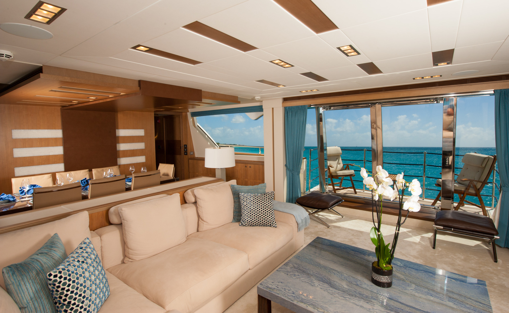 Her main salon is laid in an open plan with a relaxing lounge aft and formal dining forward. A plush L shaped sofa and bespoke leather couch, surround a beautiful marble topped coffee table. On the starboard side, she boasts a fold out balcony with seating, while aft, additional sliding glass doors lead to the shaded aft deck.