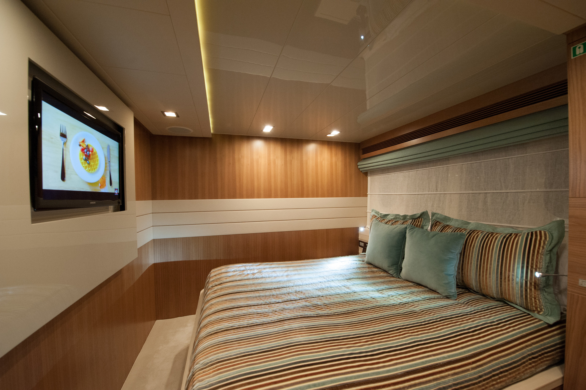 Accommodation is in 5 cabins, for up to 10 charter guests. The master stateroom is on the main deck forward and full beam of the yacht, with a king size bed, large marble ensuite, interior chaise lounge, vanity and stunning views.