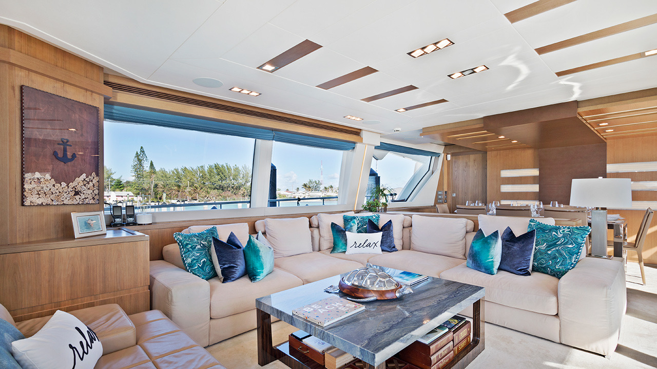 Her main salon is laid in an open plan with a relaxing lounge aft and formal dining forward. A plush L shaped sofa and bespoke leather couch, surround a beautiful marble topped coffee table. On the starboard side, she boasts a fold out balcony with seating, while aft, additional sliding glass doors lead to the shaded aft deck.