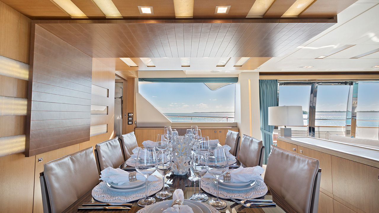 The yachts interiors are light and airy with a contemporary décor and refined neutral ambiance. Her main salon is laid in an open plan with a relaxing lounge aft and formal dining forward.